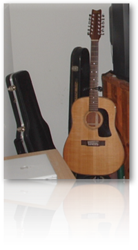 George Washburn D-29S-12 12 string guitar. Nothing fancy. I finger pick with just my bare pinkies. I never learned to use a pick; I feel a lack of control with them and the pick sound is too harsh for my taste. Three fingers and a thumb. When I strum, I use a pick so thin you can see through it, ‘cause I like that sound to be gentle, too. The strings are whatever Christy recommends, because she knows more about guitars than I do. (Coated with Gortex, she says.)